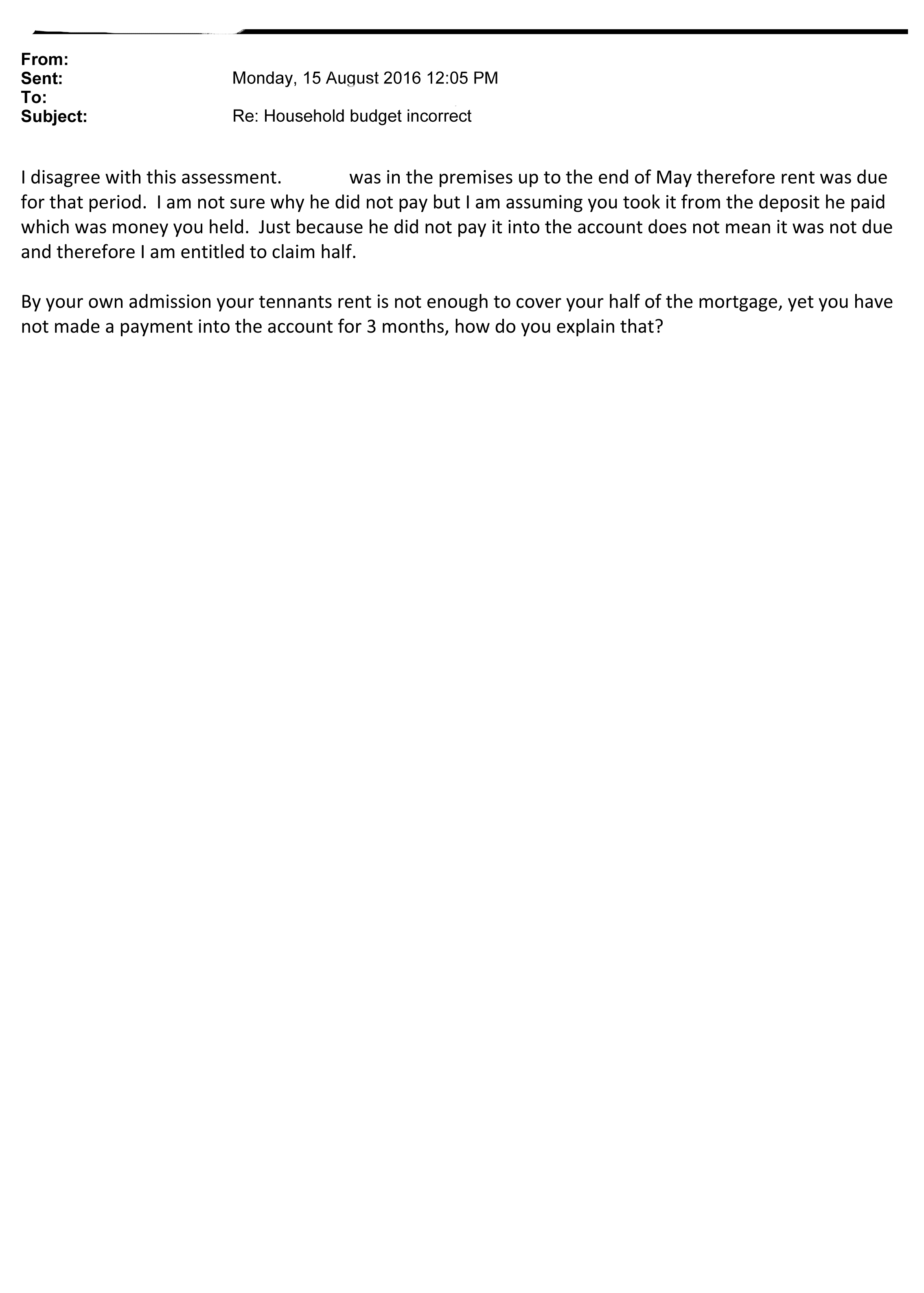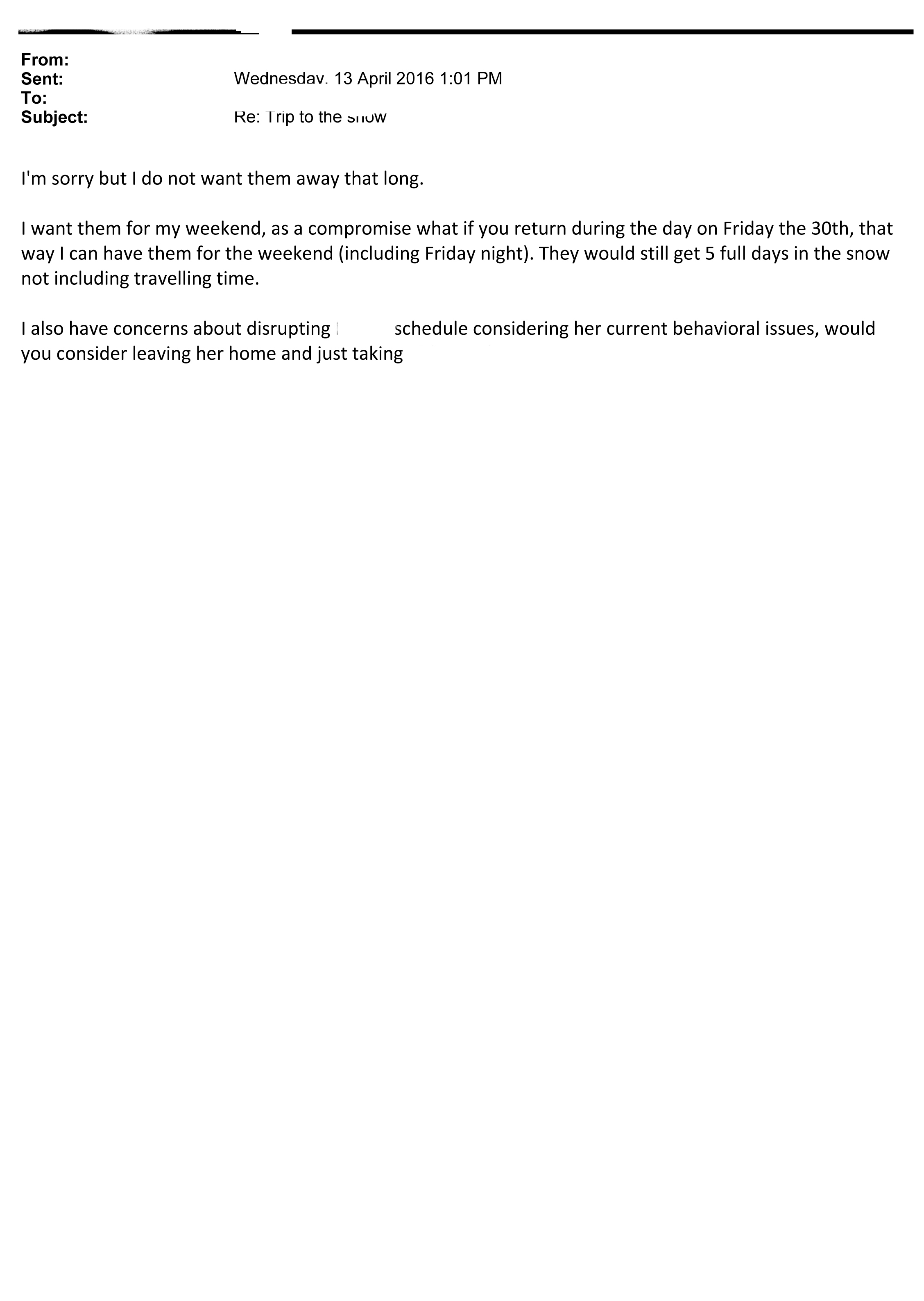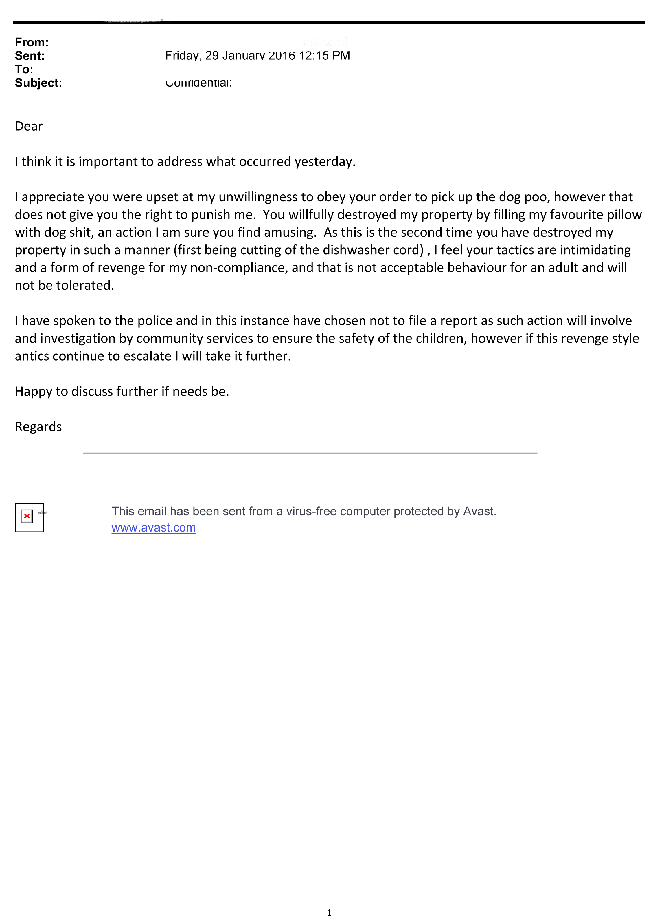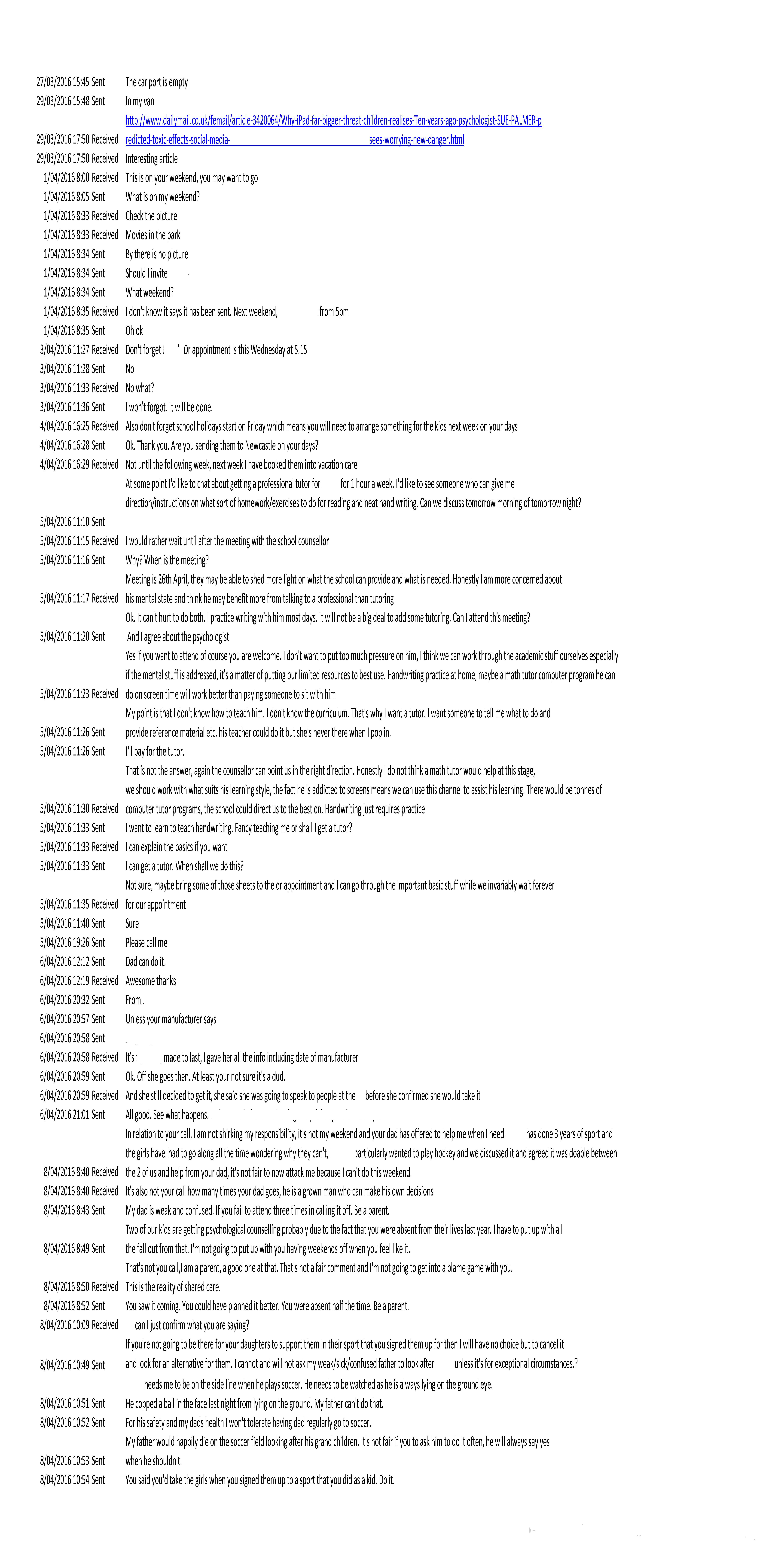 I have redacted any information that I considered necessary including names of people, places, photos etc. It doesn’t flow well as far as reading goes but you should get the idea of the sort of relationship Lea and I were having when she was alleging that she was terrified of me and suffering panic attacks when we were in the same room together.