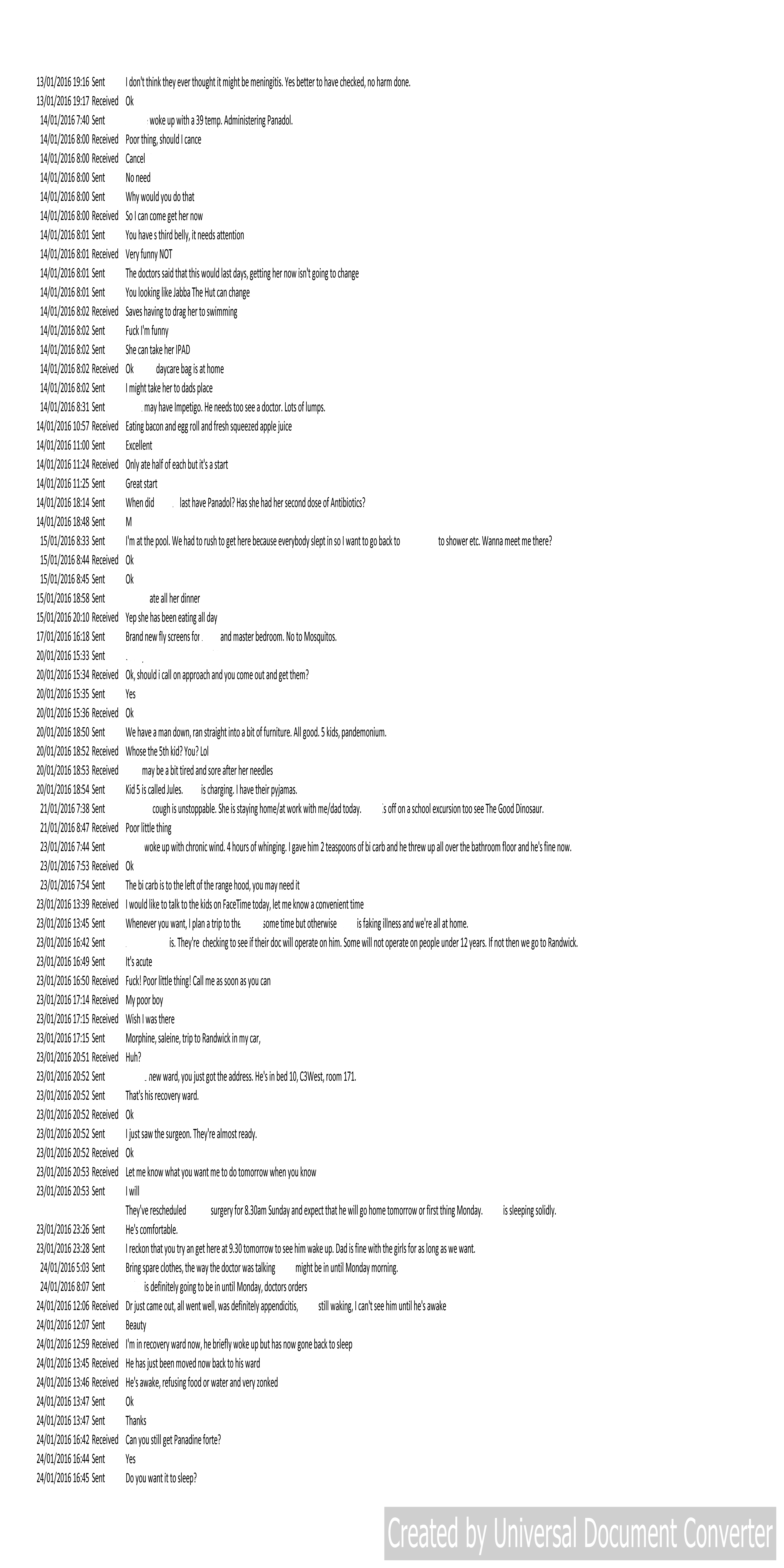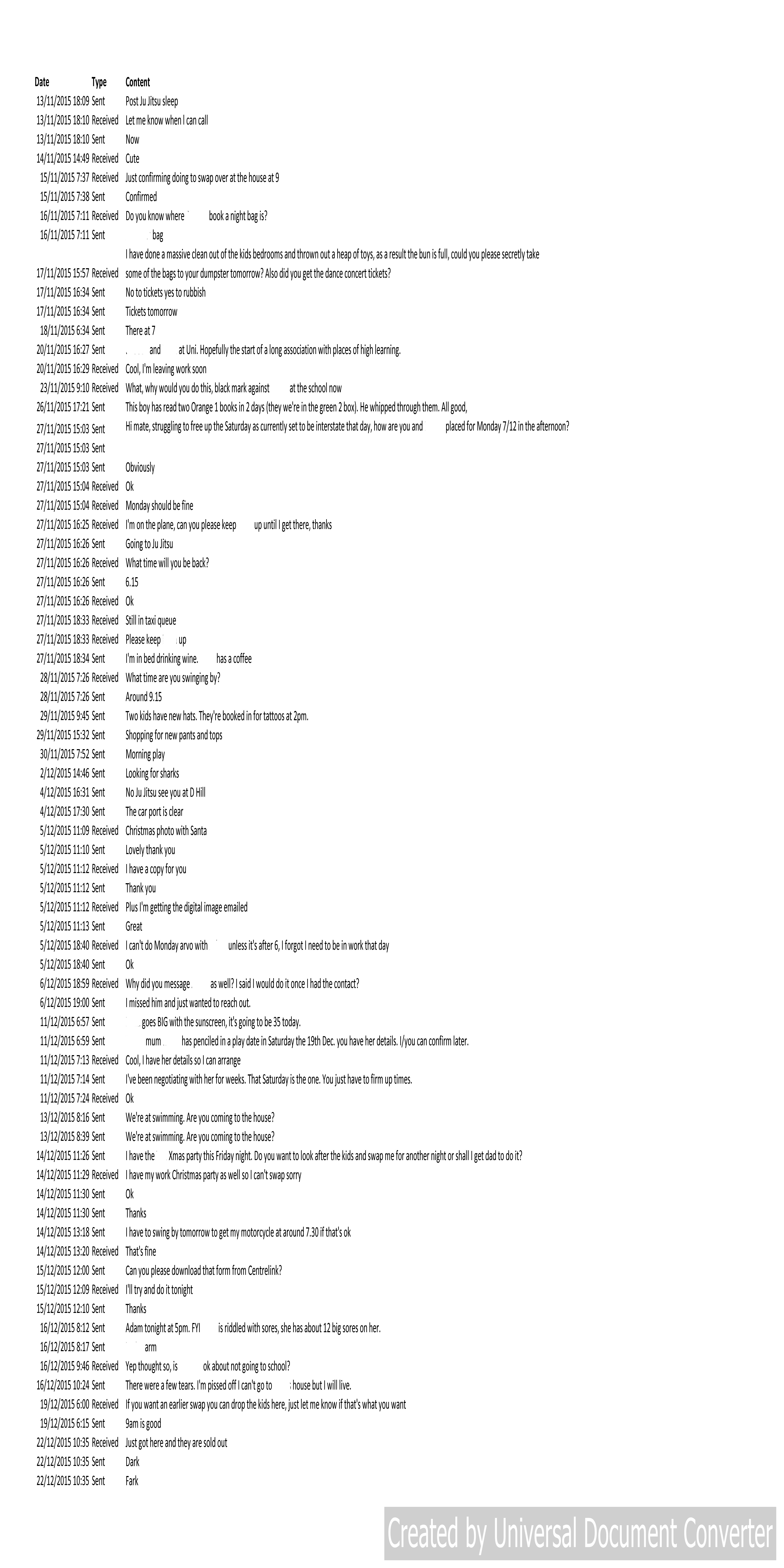 I obtained a list of all of our SMS conversations during the AVO period. I had hoped that it would be used in my defence at the trial.