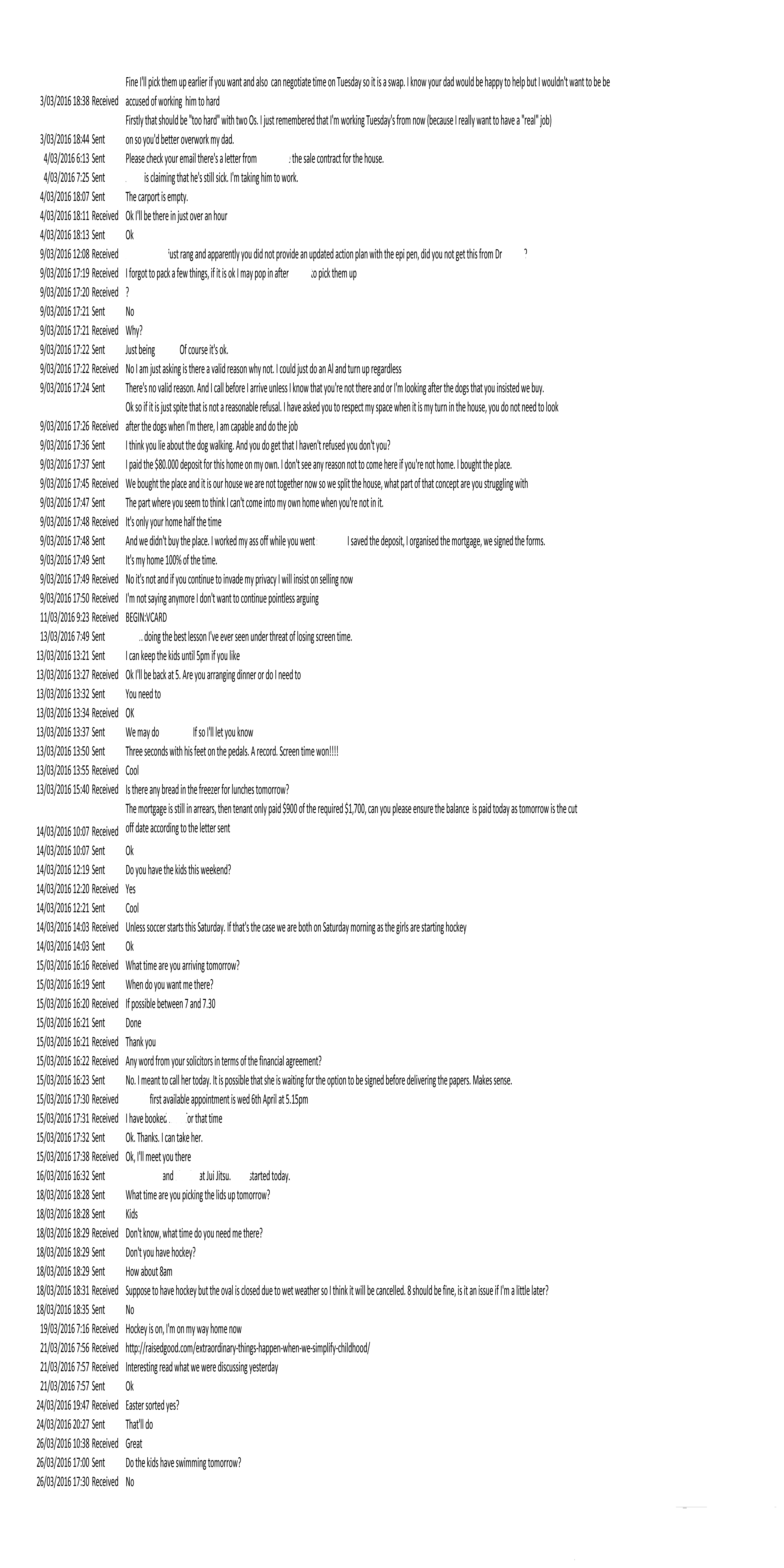 These SMSs along with the emails are all the communication that we had during the AVO period. To state the obvious they’re from my phone so the SMSs that read “sent” are from me, “received” are from Lea.