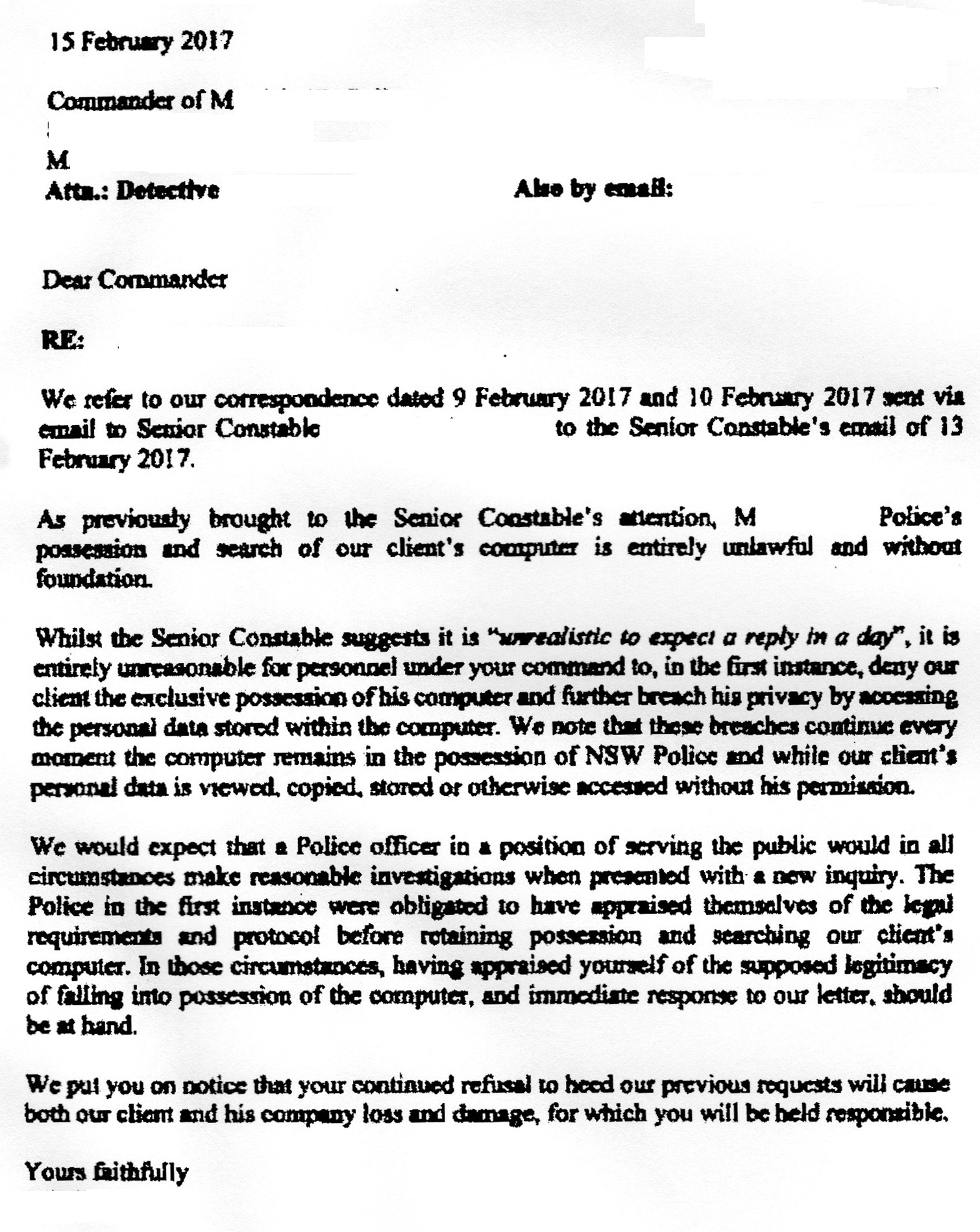 9th February 2017 My lawyer writes a letter to my local police advising them that the computer is my property and as they had no warrant they should return it ASAP. I somehow obtain a very fuzzy copy.