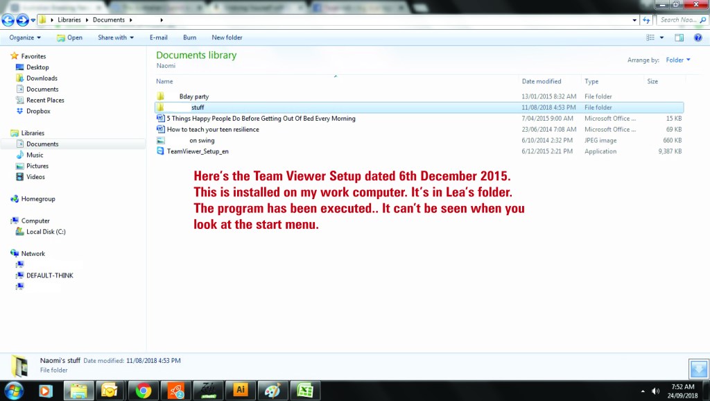 Lea and, I’m guessing, her IT trained boyfriend Matt East (not his real name) placed remote access spyware “Team Viewer” on my work computer at home in December 2015. The executable file was in a folder titled “Lea”.