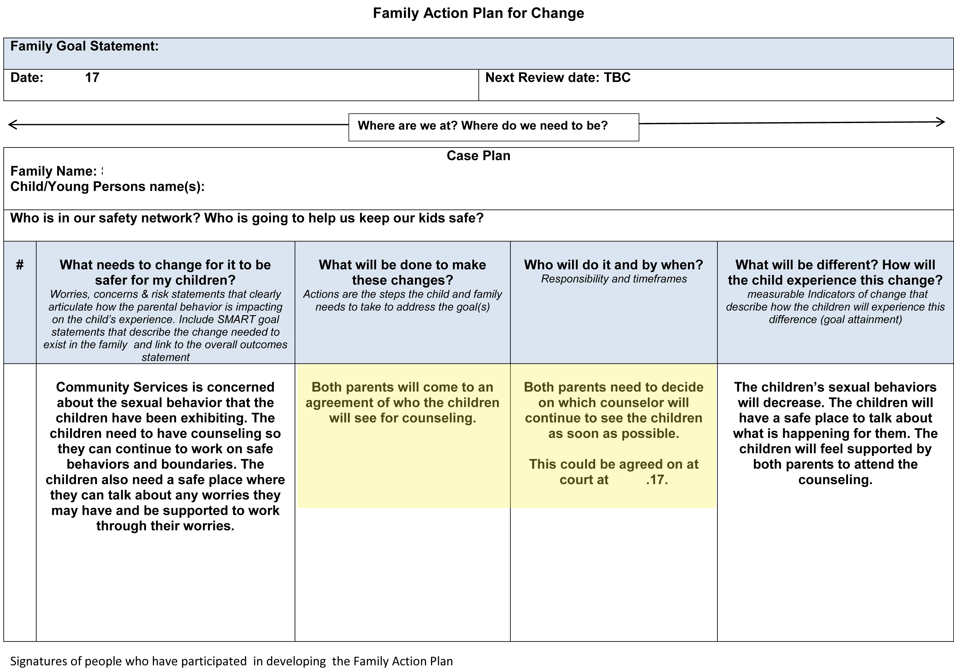 I felt that they were lying. Either way, they revised the Family Action Plan and suggested that the children had to remain in Jannawi. The plan is below, dated October 2017.